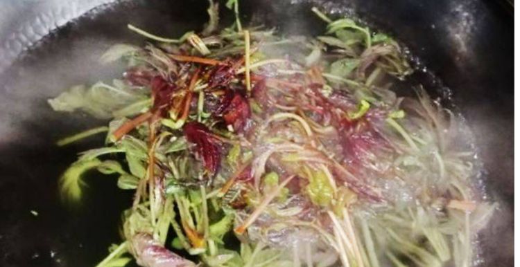 7、出锅前一分钟再下入切好的香椿翻炒均匀,加少许鲜蔬粉提鲜即可。