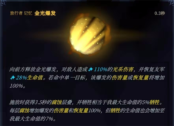 核心技能为【金光爆发】,此build以奥蕾娜为主角。