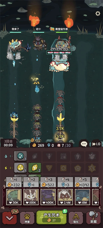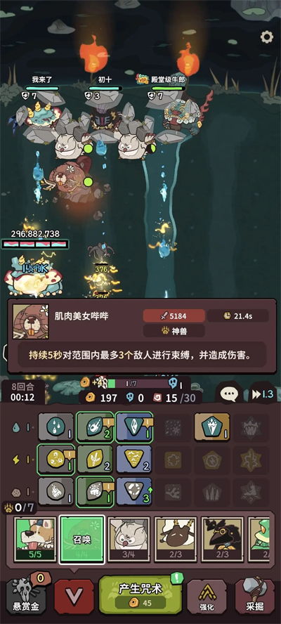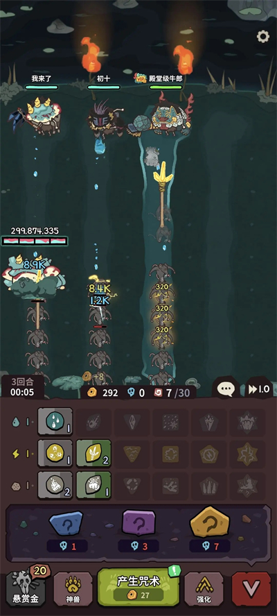 神兽召唤建议:大祭司毛毛(回血、叠伤)、乌鸦爷爷(加金币)、贤者胖胖啾(减咒术cd)、缸瓦喵(强化技能)、死神青蛙(百分比伤害)、肌肉美女吱吱(强控)、闪电小偷伊莱马斯克(存储电伤,秒BOSS)。