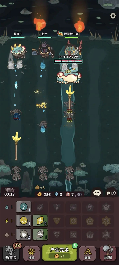 基本玩法:召唤咒术→合成高级的咒术,召唤神兽协助(不耗咒术)→成功抵御动物进攻。