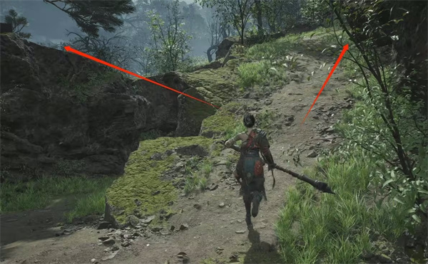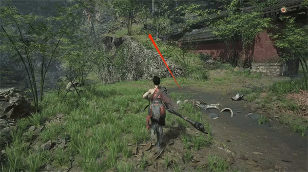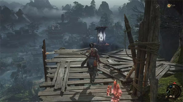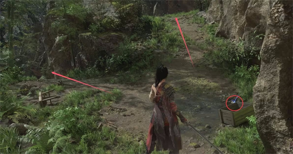 沿着佛像路线前进,你会听到女声。左边与神秘女对话可获得【成熟的赤汞*1】,前面的宝箱在河流对岸,目前无法取得,因为角色遇水即死,千万别跳进河里!与NPC对话后走右侧箭头上楼梯,乌鸦可用飞刀击杀,获得【金羽毛*1】,击杀乌鸦必定掉落【金羽毛】,使用后能随机获得三种buff之一:生命上限增加、伤害提升或体力条增加。