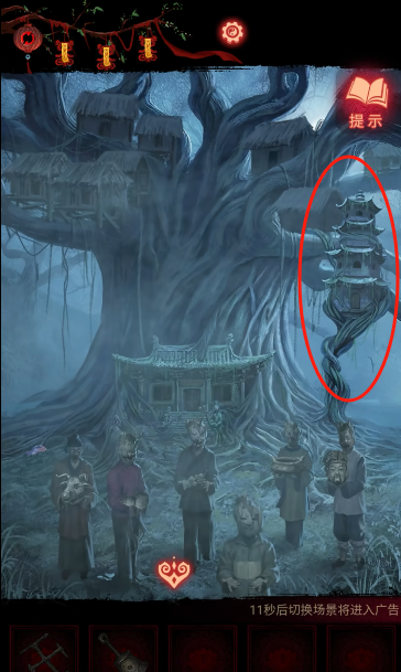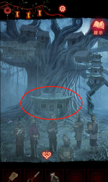 返回这个场景中点击右侧这个建筑,使用古怪树枝打开门进入