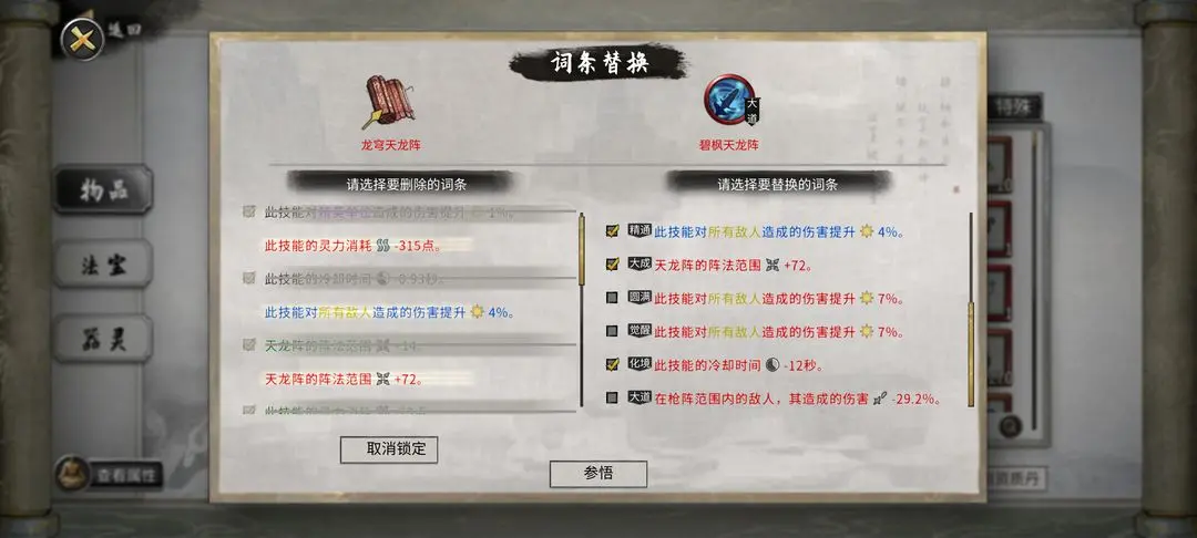 锁定不需要的词条,选择要替换的心法词条,点击参悟即可。