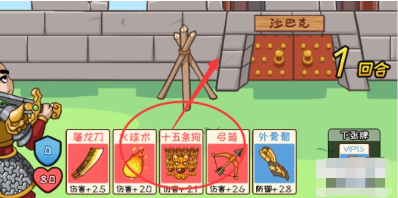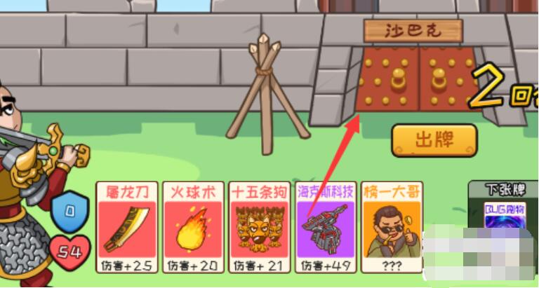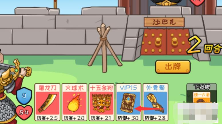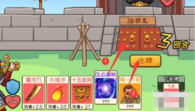 1、首先,随便选择中间的牌输出,只要留下屠龙刀和外骨骼这两张牌。