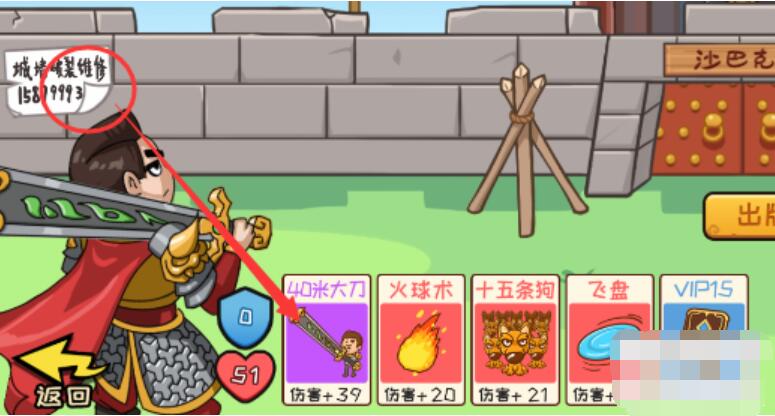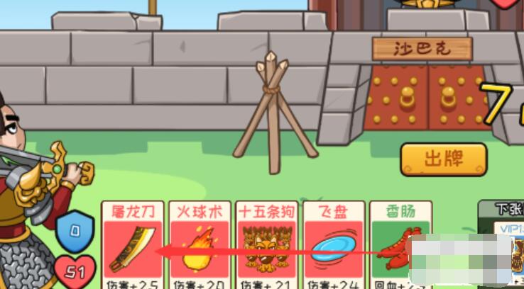 5、在第7回合会刷出香肠,将香肠移动到屠龙刀上,会变成40米大刀,然后点击城墙上的小广告,会出现999.