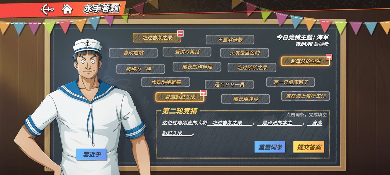 热血航线猜猜猜活动,性格刚直的大将,身高很高,而且长得凶,性格非常沉稳。
