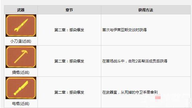 1、小刀(副近战):第二章(感染爆发)首次与伊莱亚斯交谈时获得。