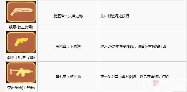 8、战术手枪(副武器):第六章(下管道)进入2A之前拿到图纸,然后在重铸站打印。