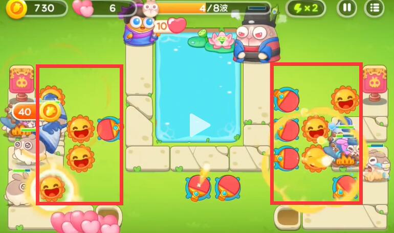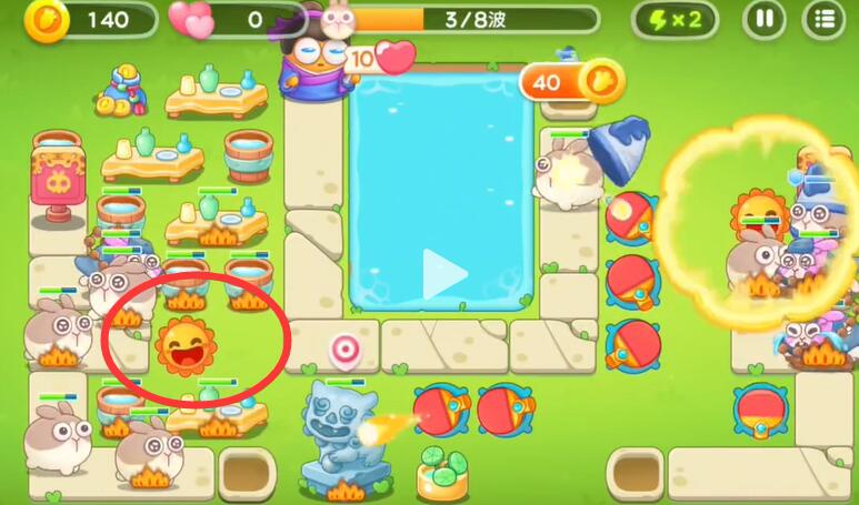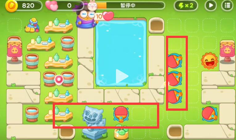 1、在右边的出口放置一个太阳可以将这里的兔子与建筑全部清理。