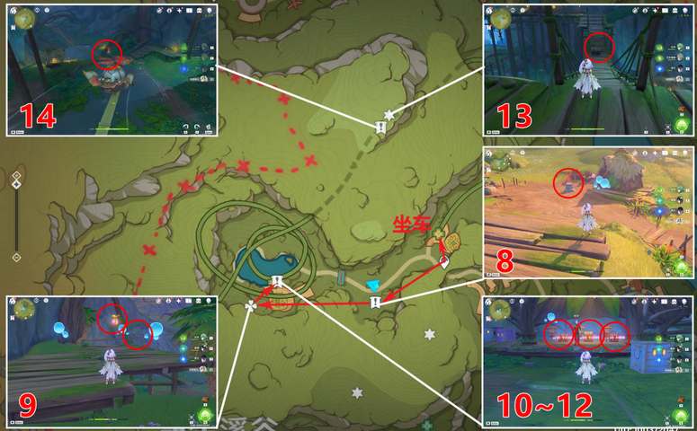 3、在洞窟内的礼券位置如图,10~12为宝箱挑战,通过与告示牌交互开启。13/14通过乘坐轨道车过去;