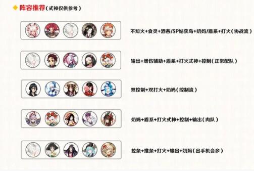 输出+增伤辅助+盾系+打火式神+控制(正常配队)