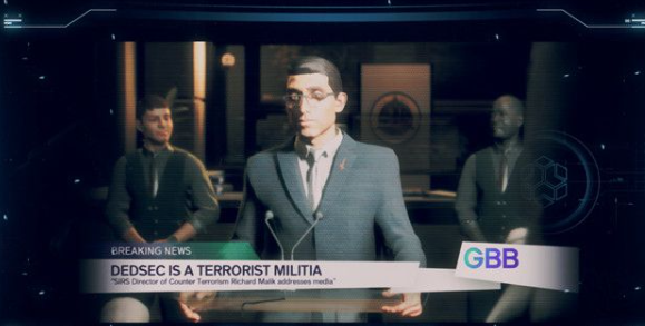 2、此时出现马里克的新闻,其将DedSec列为恐怖组织,并呼吁国家进行围剿。