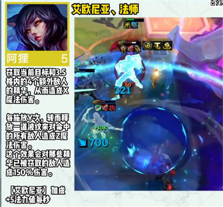 1:阿狸,羁绊为艾欧尼亚,法师,技能效果是窃取当掐你目标和3.5格内的四个额外敌人精华,从而造成一定的魔法伤害,每释放n次,转而释放一道波纹对于命中的所有敌人造成一定的魔法伤害,这个效果会对那些精华已经被窃取的敌人造成百分之一百五的伤害;