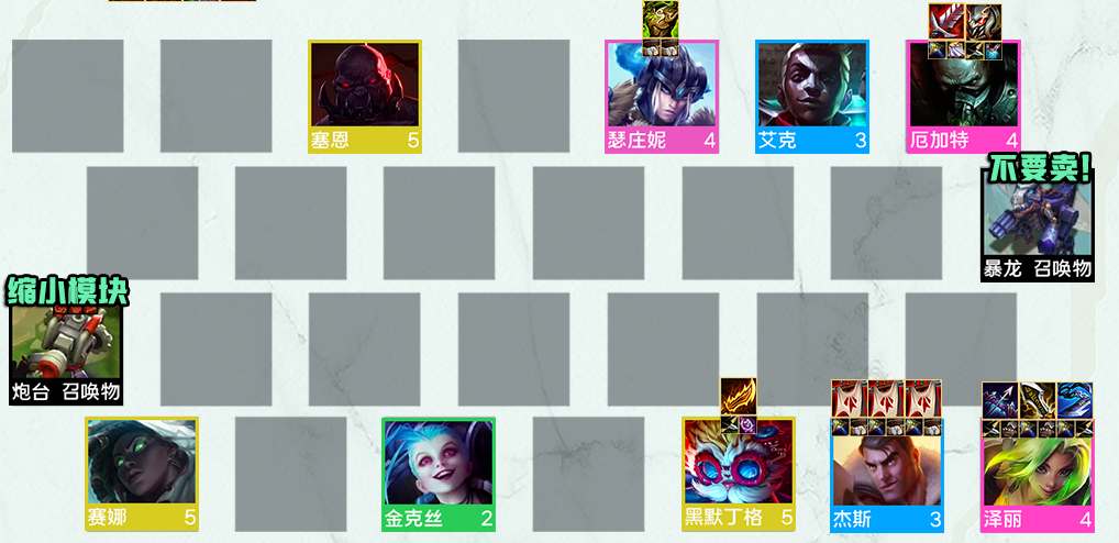 1、阵容构成:金克丝+艾克+泽丽+杰斯+厄加特+猪妹+大头+赛娜+塞恩;