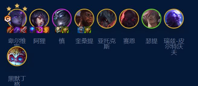 阵容推荐:卑尔维斯,阿狸,慎,老黑,剑魔,塞恩,瑟提,瑞兹,大头
