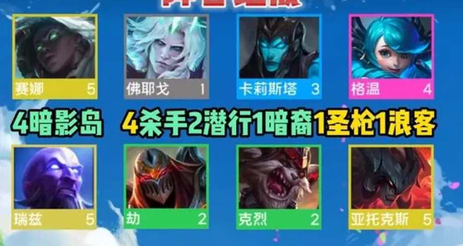 2、阵容羁绊:4暗影岛4杀手2潜行1暗裔1圣枪1浪客;