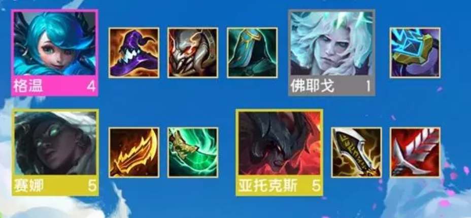 3、英雄之力推荐选择小法,可以拿到珠光莲花的海克斯,有了珠光莲花格温就可以不带法爆。格温主c装备选择泰坦、水银和大帽。佛耶戈带离子火花削弱敌人魔抗,赛娜带羊刀+青龙刀,剑魔带物理输出或吸血装备。