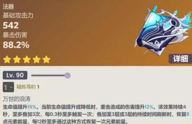 1、那维莱特专武名为【万世流涌大典】,这个法器90级的基础属性加成为542基础攻击、88.2%暴击伤害;