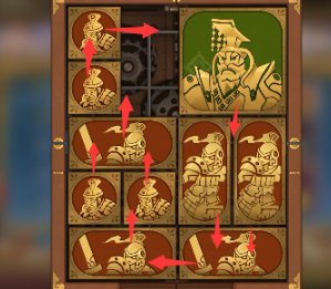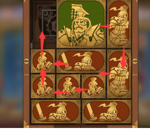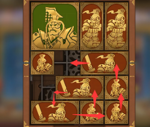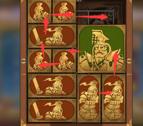 5、左上角的正方形向右移动,其下方的长方形向上左边的正方形也向上,将军旁边的正方形向左,将军向左右下角的长方形向上其旁边的长方形向右。