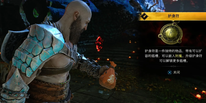 战神诸神黄昏在玩家主线推进到第一次在华纳海姆击败boss后,会让玩家捡起世界之树的护身符,护身符开始时只会解锁两个但其有九个空位,后续的buff需要玩家自己去收集并放入护身符中。