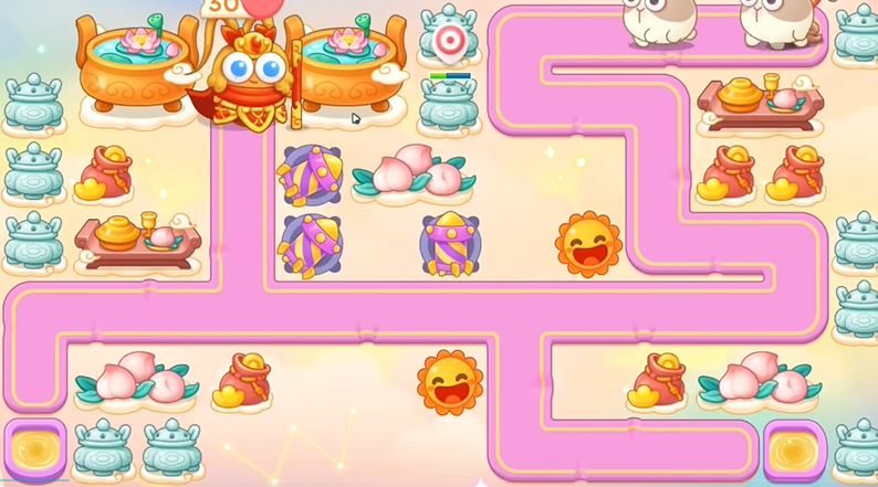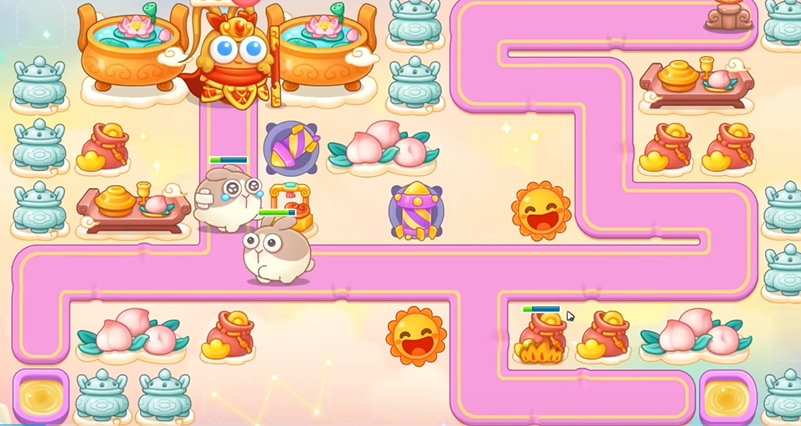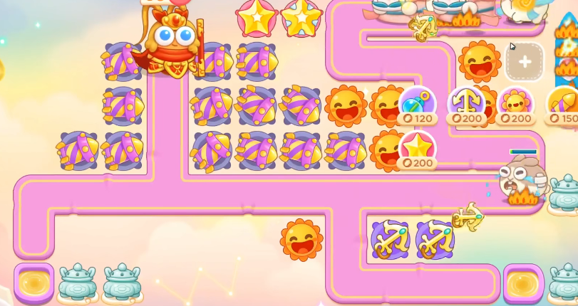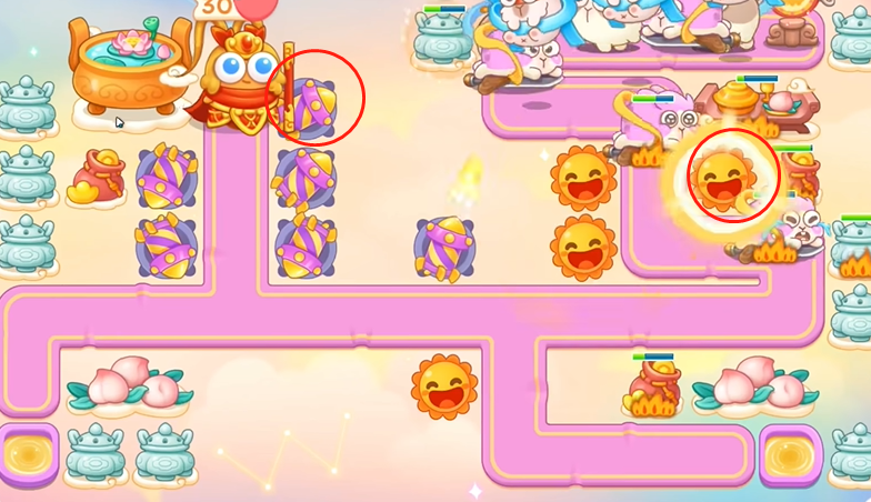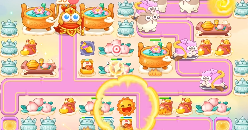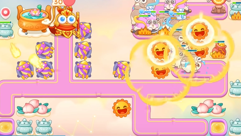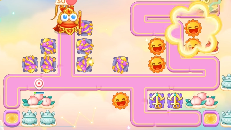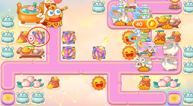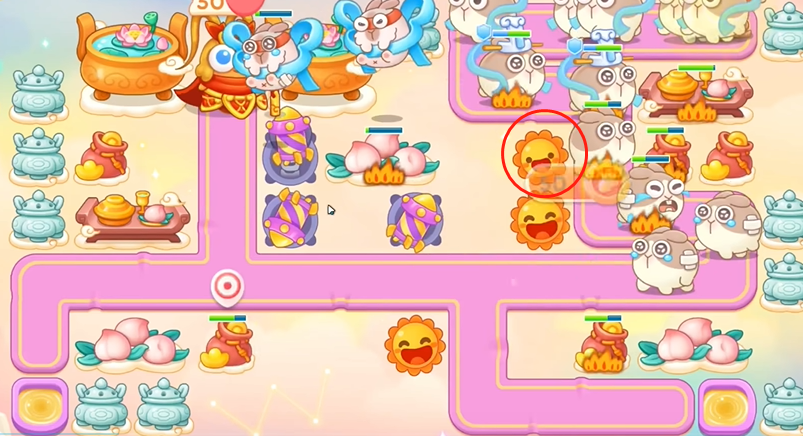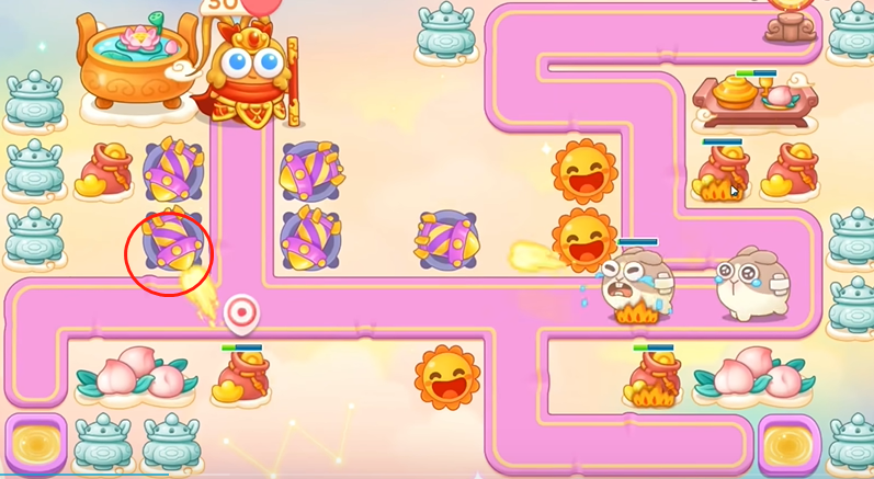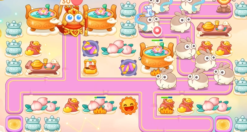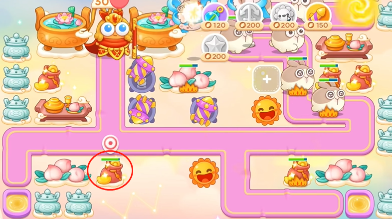1、建立三级太阳,一级导弹,导弹打桃子,有金币了给导弹升二级,粉兔过来锁定粉兔。