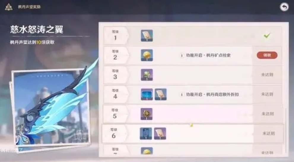3、每次升级都可以领取到对应的奖励,10级奖励为风之翼皮肤——慈水怒涛之翼。