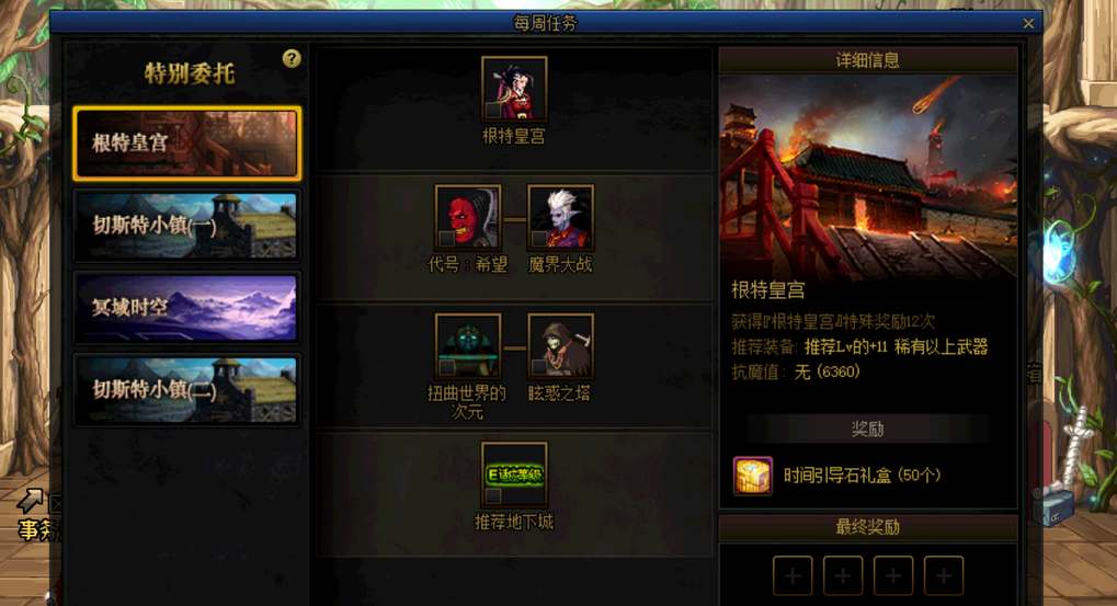 1、每周委托任务分为根特皇宫、切斯特小镇(一)、冥域时空以及切斯特小镇(二)四个区域,不同区域难度不一样,玩家只需要选择一个区域任务完成即可;