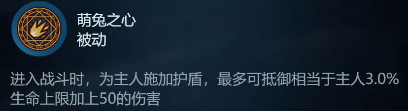 萌兔之心 1级(专属被动)进入战斗时,为主人施加护盾,最多可抵御相当于主人3.0%生命上限加上50的伤害。