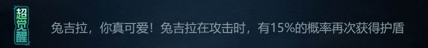 超觉醒:【萌兔之心】兔吉拉,你真可爱!兔吉拉在攻击时,有15%的概率再次获得护盾.