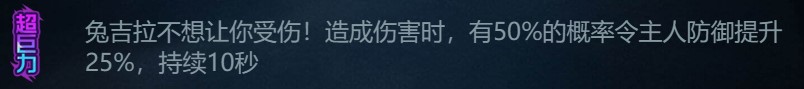 超巨力:【萌兔之心】兔吉拉不想让你受伤!造成伤害时,有50%的概率令主人防御提升25%,持续10秒。