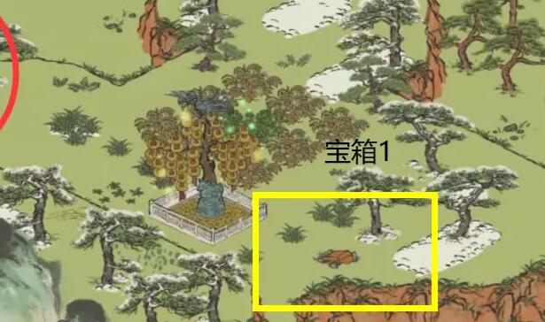 第一个宝箱在如图所示右下角的树