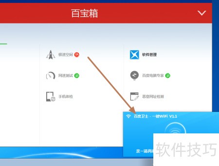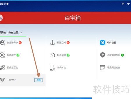 - 打开百度卫士百宝箱,找到一键WiFi功能并点击下载按钮。
