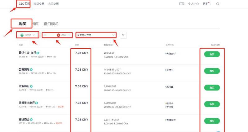 3.在C2C市场购入USDT作为交易基础货币