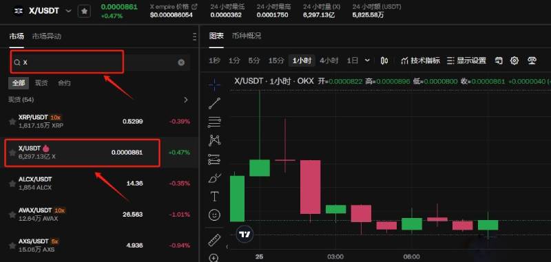 4.进入币币交易专区搜索X/USDT交易对