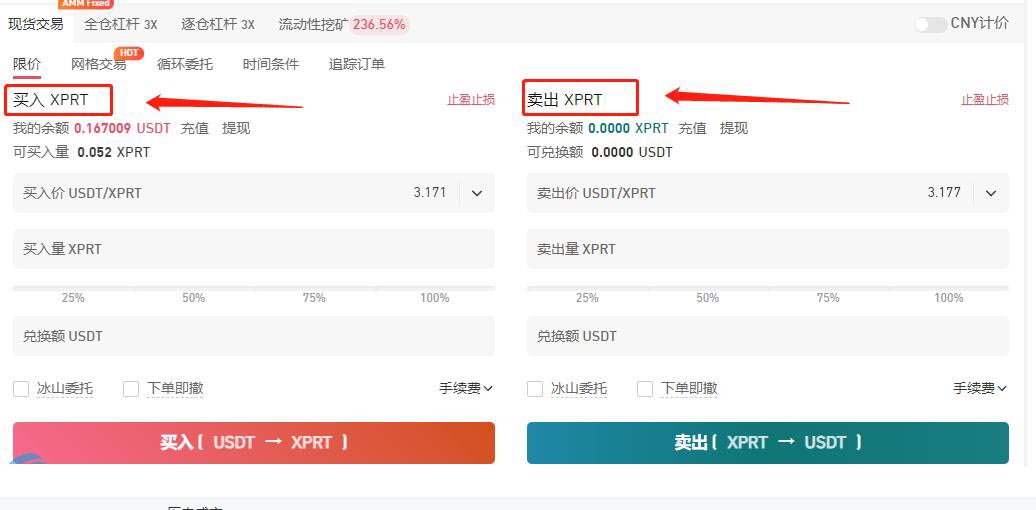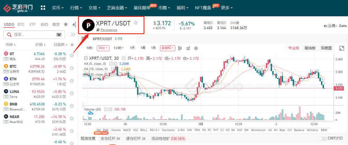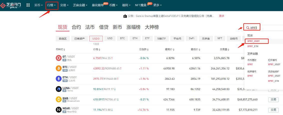 2.进入行情页面,搜索XPRT并选择XPRT/USDT交易对