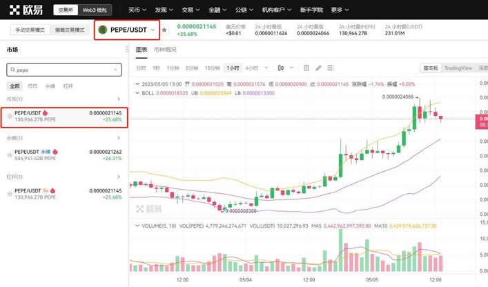 5.搜索PEPE/USDT交易对,查看实时行情数据