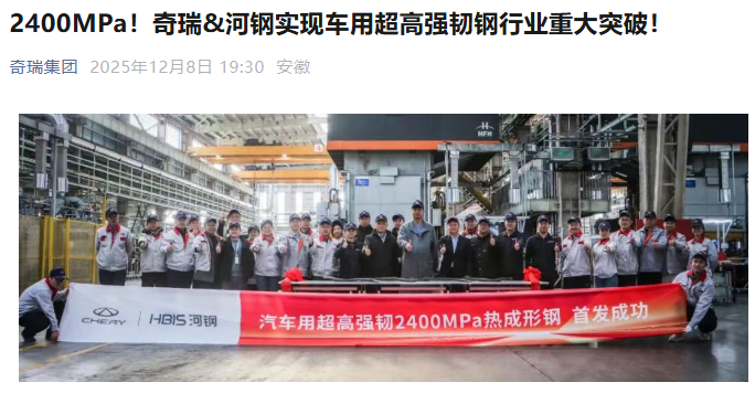 12 月 8 日消息,据奇瑞集团官方,12 月 5 日,奇瑞汽车与河钢集团正式首发联合开发的汽车用超高强韧 2400MPa 热成形钢板。这一突破性成果,使中国汽车材料在超高强区间实现重要跃升,也展示出我国在关键基础材料研发上的持续提升与自主创新实力。