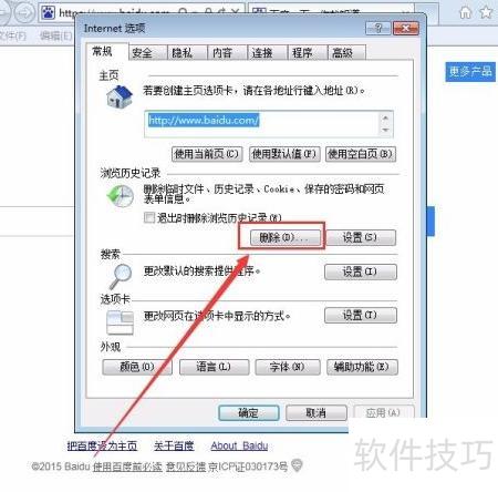 - 打开Internet选项后,点击浏览历史记录下方的删除按钮,操作所示。