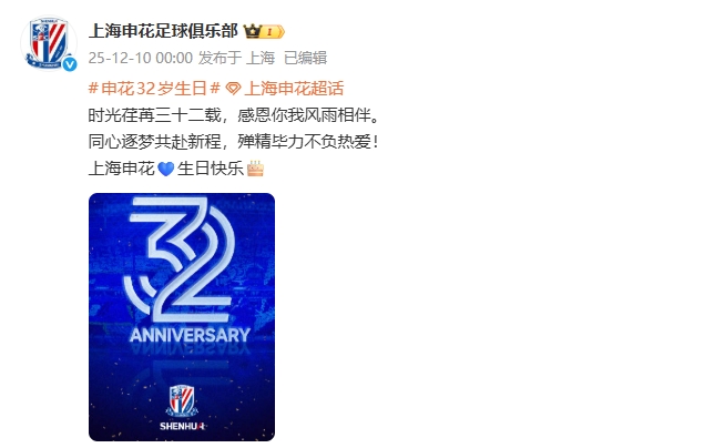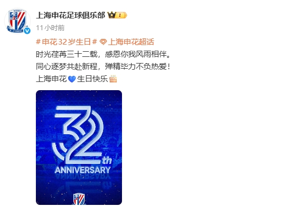 申花官博最早的配图上,“第32个纪念日”的英文采用了“32th anniversary”的写法,但正确的翻译应为“32nd anniversary”。目前申花官博更换了新的配图。