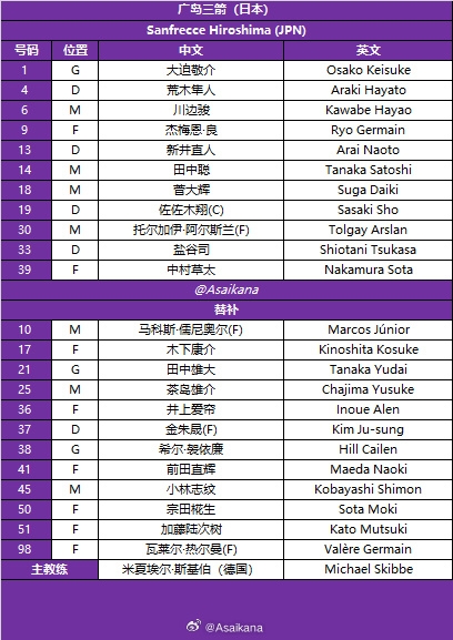 广岛三箭首发:1-大迫敬介、4-荒木隼人、13-新井直人、19-佐佐木翔、33-盐谷司、6-川边骏、14-田中聪、18-菅大辉、30-托尔加伊·阿尔斯兰、9-杰梅恩·良、39-中村草太