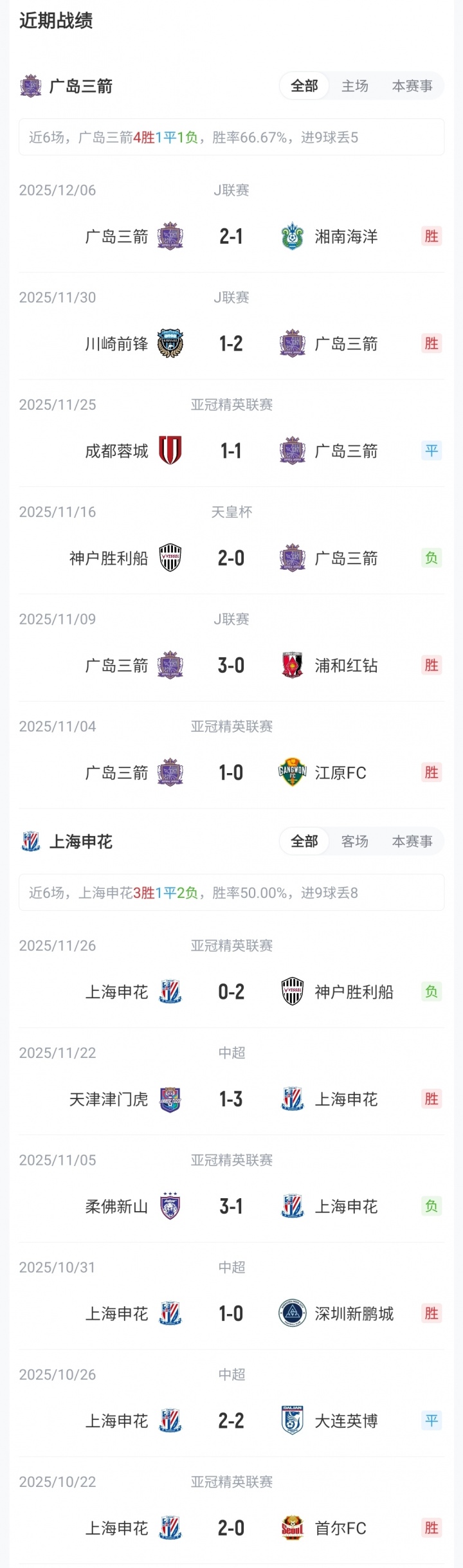 目前亚冠精英联赛东亚区积分榜上,上海申花1胜1平3负积4分,位列第11;广岛三箭2胜2平1负积8分,位列第5。