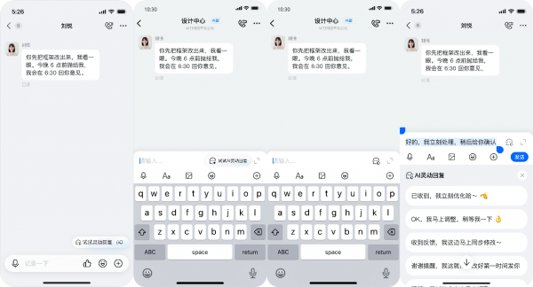 AI 可以基于当前聊天对话的上下文,识别用户与对话对象的身份及组织关系,自动生成 4-6 条涵盖简洁、专业、主动确认、轻松活泼等多种语言风格、不同语气口吻的回复建议。用户可在此基础上再次编辑后发送,既保持个性表达,又大幅降低组织措辞的时间成本。