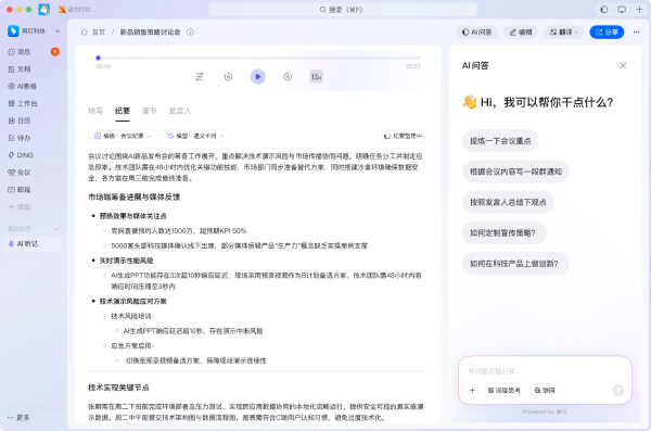 钉钉 AI 听记自发布以来,已经变成了很多人的工作学习效率神器。上新 AI 问答功能后,AI 听记不仅能记录并转写总结,还能基于沟通内容检索信息,回答问题,识别沟通中提到的待办和行动。