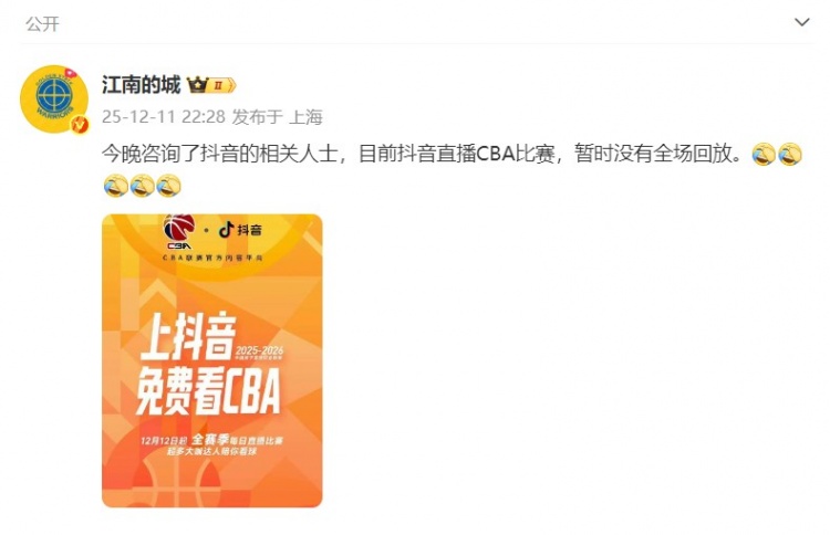 媒体人@江南的城 在社媒上写道:“今晚咨询了抖音的相关人士,目前抖音直播CBA比赛,暂时没有全场回放。”