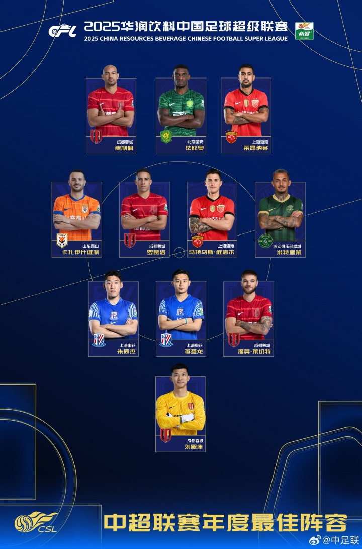 直播吧12月12日讯 今晚,2025赛季中国足球职业联赛颁奖会正在进行,中超本赛季最佳阵容公布,法比奥、卡扎伊什维利领衔,罗慕洛、米特里策、蒋圣龙等球员入选。