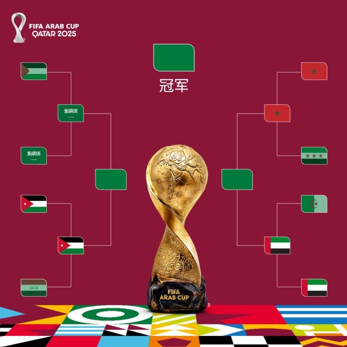 此前进行的1/4决赛,沙特淘汰巴勒斯坦、约旦淘汰伊拉克、摩洛哥淘汰叙利亚、阿联酋淘汰阿尔及利亚。